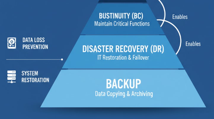 Disaster Recovery (DR): The strategic processes and tools to restore entire IT infrastructure and applications after a catastrophic event. DR is about resuming business operations, not just recovering files.